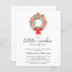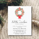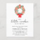 Planejar um chá de fraldas de Natal / Feriado? Este simples convite moderno é decorado com uma coroa aquática festiva de biscoitos de pão de gengibre, colly, folhagem de pinheiro, e um arco vermelho. Diz "O nosso biscoito está a caminho" na tipografia da na moda. Facilmente personalizável. Original Watercolor © Michele Davies.