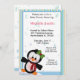Convites para bebês de pinguim bonitos só para garotas. Um fundo colorido. O pinguim tem um arco de cabelo verde giro e está parado em um icebergue. Kristi W/Graphic's n Bits.