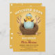 Adorável convite ao chá de fraldas, com um pintinho amarelo doce eclodido a partir de uma casca de ovo azul num ninho confortável, rodeado por delicadas flores de primavera cor-de-rosa.