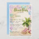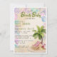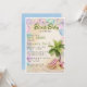 Um convite para chás de fraldas de praia é uma borda de conchas coloridas com palmeiras, cadeira de praia, anel de preservador de vida (boia) e bebê no canto direito do fundo. Atualize facilmente a fonte do marcador de posição para um convite verdadeiramente exclusivo e divertido para gerar algum entusiasmo sobre a sua próxima bênção!