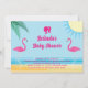 Este Convite para Chás de fraldas tropicais, cor-de-rosa e azul, acentua-se com uma menina fuchsia num rabo de cavalo e um casal de flamingos bonitos, dando-lhe uma sensação lúdica e de Barbiecore. Se forem necessários itens de coordenação adicionais, entre em contato conosco em prettyfancyinvites@gmail.com com o seu pedido.