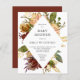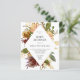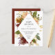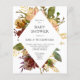 Um belo convite rústico para chás de fraldas com buquê de cor d'água em tons de paprika, laranja, burgundy, castanho, dourado, rosa, pêssego, ferrugem, marfim e creme moldando o texto de cinzas escuras em forma de diamante branco ou lozenge. O inverso é uma sombra equivalente de burgundy. Ideal para um chá de fraldas de outono.