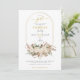 Um convite para chás de fraldas florais de cor d'água, com estilo bonito de terra, de forma neutra, com cor de ouro neutra, com cor cremosa e toques de folhas verdes, e palmetto secas. Verde no verso do convite. Uma bonito mistura de guião e serifa colorida em matizes douradas e de pérolas pastel. Estilo rústico da Terra.