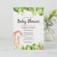 Design de chá de fraldas de com tema do zoológico tropical, com uma ilustração de designs de folhagem tropical verdes e caprichosas, em cima e em baixo, ao lado da ilustração da doce mamã e da girafa do bebê. Personalize usando os campos fornecidos ou use a função "Personalizar Mais" para ajustar fontes, tamanhos e espaçamento. Se precisar de ajuda ou cores adicionais, entre em contato conosco.