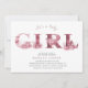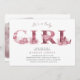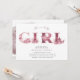 Watercolor floral script "girl" com folhagem simpática e pássaros, juntamente com toda a informação em serif. belo esquema de cor vermelho da paleta para gênero revela chá de fraldas e layout moderno.