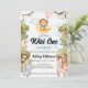 Animais Selvagens Selvagens trabalho de arte de uma girafa, leopardo, rinoceronte, leão, elefante e zebra desenhada à mão em um cartão-modelo de-convite para chás de fraldas tema Safari. "Um pouco selvagem está a caminho", completa o escritor. O convite ideal neutro em termos de gênero.
