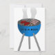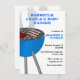 Convite personalizado divertido para o chá de fraldas do casal feito em branco, com gráficos de uma grelha azul de churrasco, no lado esquerdo e no verso. O texto em azul e preto está pronto para personalizar o evento de chá do seu bebê.