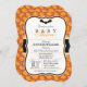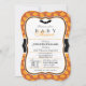 Um chá de fraldas neutro do Halloween elegante convida para um padrão laranja de abóbora. Possui um cabeçalho de morcego preto com teia de aranha e padrão de abóbora. Convite para excelente para chás de fraldas de outubro.