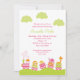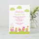 Convite de chá de fraldas bonito com animais da selva que andam de comboio em tons cor-de-rosa e verde.
