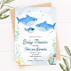 convite para chá de fraldas lgbt com duas mães. Este convite para chás de fraldas tem ilustrações de aquarelas pintadas manualmente, dois tubarões-mamãe, um pequeno tubarão-bebê, e sob os elementos do mar. Perfeito para um chá de tema náutico. Parte do texto é editável.