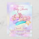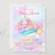 Magical arco-íris, bebê unicórnio rosa e cor-de-rosa, e modelo de convite para mãe unicórnio.
