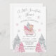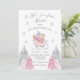 Um pequeno convite para chá de fraldas de bebê rosa floco de neve. Feito em cor rosa doce e cinzas/aquarelas prateadas. Um pequeno urso num trenó rodeado por flocos de neve rosa e cinza. As lascas de prata falsas acendem os pinheiros. Perfeito para aquele chá de fraldas de inverno. 100% de satisfação do cliente com o "Zazzle"