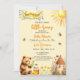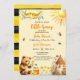 Um Chá de fraldas doce com abelhas, ursinho, colmeia, pássaros pequenos e flores amarelas na frente e lindas listras amarelas e negras nas costas! Você pode personalizar este convite com seus próprios detalhes.