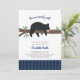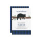 O convite para chá de fraldas de ursinho preto apresenta um urso doce e adormecido em um galho de árvore com sotaques de checagem de búfalos azuis e pretos. Assista à coleção para itens de coordenação recém-adicionados.
