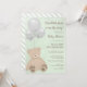 Um pequeno filhote de ursos na forma como o convite para chás de fraldas apresenta o filhote de ursinho d'água e balões em castanho e verde neutro em gênero. A parte de trás do convite tem faixas de aquarela diagonais e blocos para bebês.