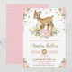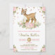 Convite para Chás de fraldas maravilhoso com a ilustração original em aquarela de um veado bebê e de flores rosadas e escamas femininas cor-de-rosa e confete em ouro falso