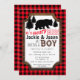Flannels e o exterior, há um rapaz prestes a ser nascer! Comemore um dia especial com este Chá de fraldas Convite apresentando um bebê urso e pinheiros em uma estrutura de madeira e fundo de xadrez vermelha.