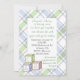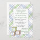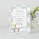 Bonito convite para chás de fraldas, feito em uma xadrez verde-pálida, branca, azul e cinza, com uma área de texto branca, no meio. Gráficos de blocos de bebê correspondentes, no canto inferior esquerdo da área de texto. Personalize todo o texto do seu chá de fraldas para um convite elegante para a mãe ser Will love.