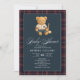 Traga o charme de pré-disquete para a sua celebração com nosso Convite para Chá de fraldas de Urso. Apresentando um ursinho de pelúcia num uniforme vintage de baseball com taco e bola, enquadrado por um fundo de marinho e uma fronteira escocesa de tartan vermelha e azul. A caligrafia elegante e as fontes clássicas de serifa completam esse design de eterno — perfeito para brunches, festas de jardim ou encontros acolhedores.
