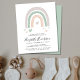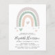 Um convite para chá de fraldas de bolos, divertido e moderno, com uma aquarela abstrato de um arco-íris verde-sábio, laranja e lavanda com corações, o nome da mãe num roteiro de na moda e os detalhes do chá em uma simples tipografia.