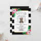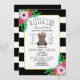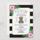 Um convite para o chá de fraldas com a ilustração de um urso bebê vestindo uma coroa de flores rosa. Personalize o texto. O fundo é um padrão listrado preto e branco.