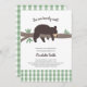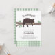 O convite para chá de fraldas de ursinho castanho apresenta um urso doce e adormecido em um galho de árvore com sotaques de checagem de búfalos brancos e verdes. Assista à coleção para itens de coordenação recém-adicionados.