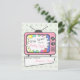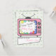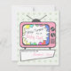Um convite para o chá de fraldas com uma ilustração de uma tv cor-de-rosa com antenas de ouvido de coelho e uma tela de teste. O texto na TV diz "Fique Ocupado Por Uma Garota." O texto abaixo diz "Trazido para você por". Personalize com o nome da mamãe a rosa. O fundo é verde-claro com bolinhas verdes claras. Personalize o lado oposto com detalhes do evento.