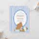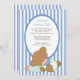 Chá de fraldas de urso de pelúcia bonito. Design apresenta o bebê mais bonito vestindo uma fralda segurando uma garrafa de bebê colocada sobre um fundo azul e branco de stripe. Correspondência entre selos e autocolantes disponíveis em nosso compro em www.clebrateitinvites.com