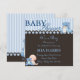 Este Convite para chás de fraldas personalizável moderno apresenta ursos de pelúcia azul e bebê em um fundo azul e castanho listrado. Personalize-o adicionando seus detalhes na fonte de sua escolha! com