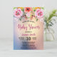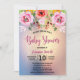 Convite para Chá de fraldas Floral Moderno Elegante. Design de elementos florais e chá de fraldas em script de tendência. O fundo está em tons cor-de-rosa e azuis cobertos de brilho dourado. Adicione detalhes da parte à frente. Clique em personalizar para editar fonte/ cor/ estilo ou mover texto etc.