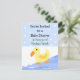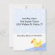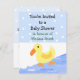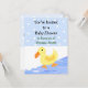 Um fundo macio de azul com bolinhas brancas. Um pato amarelo giro flutuando na água. Personalize com todas as informações do seu chá de fraldas conforme desejado.