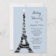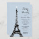 Luzes cintilantes repicantes decoram a Torre Eiffel em um fundo azul macio, neste convite para chás de fraldas inspirado em Paris.