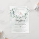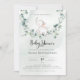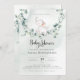 Um pequeno elefante giro numa oscilação de eucalipto. Este convite para chás de fraldas apresenta aquarelas desenhadas à mão e fontes modernas.