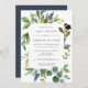 O convite para chás de fraldas botânicos elegante enquadra seus detalhes de chá de fraldas com uma borda de folhas de eucalipto de cor d'água, flores azuis e folhagem verde. Convites inverso a marinho enfumaçado sólido azul.