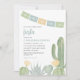 Um chá de fraldas de fiesta para honrar a futura mãe. Este convite temático do cacto apresenta um belo design do deserto de aquarela em tons delicados de azul empoeirado, amarelo e verde do deserto. Perfeito para uma festa de chá de fraldas a sudoeste ou moderna.
