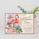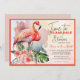 Design de aquarela colorida de um flamingo, flores e folhas tropicais faz um belo convite a chás de fraldas (ou simplesmente atualiza o texto para qualquer outro tipo de convite) com um título ousado que lê "Hora de Flamingle"