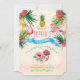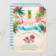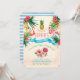 Flamingos, abacaxis, flores de hibisco e folhagem adornam essa versão moderna de um convite de chá de fraldas. Cores brilhantes e uma faixa azul anunciam sua festa de chá de fraldas com estilo. Voltar do convite em listras azuis de cor aquosa.