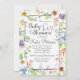 Um belo convite para chás de fraldas com flores e folhagem de cor branca, rosa, azul, roxa e verde. Este convite inclui o texto das cinzas e é neutro em termos de gênero.
