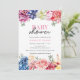 Convide seus convidados para o seu chá de fraldas com este belo convite para Chás de fraldas florais coloridos com flores de aquarela e um fundo padronizado. Adequado para uma mãe esperando uma menina, ou mudar a cor de fundo para se adequar à sua festa. © Mini Moi Impressões
