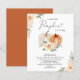 Um convite para o chá de fraldas, com tema de outono, favorável ao orçamento, com "uma pequena abóbora doce está a caminho" numa mistura de simples tipografia e um roteiro com um inchaço cardíaco, e aquarelas de laranja, coral e creme-abóboras e buquês florais. Especificar o sexo do bebê, se desejado (por exemplo, "está a caminho").