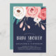 Um convite bonito e moderno para o chá de fraldas em marinho, coral e chalé, com flores desenhadas à mão e letra escrita com pincel.