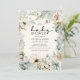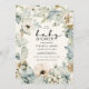 Este elegante convite para chás de fraldas florais de inverno apresenta lindas folhas e bagas azuis poeirentas pintadas à mão, flores de anêmona creme, verde-salva e pinecones organizados como um quadro de na moda num marfim | fundo creme. Encontre itens correspondentes na Coleção Floral de Azul de Inverno.