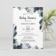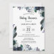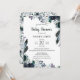 Chá de fraldas Floral Escuro Convite em marinho, verde-floresta, marfim e preto sobre fundo branco com peões e penas. O verso do convite tem um padrão floral semelhante.