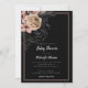 Um convite de chá de fraldas muito escuro com flores bege e rosa, samambaias, penas rasas, perucas e bagas em fundo preto.A tipografia gótica adiciona ao sentimento escuro. Veja a coordenação de itens no nosso compro, Encantado Finch.