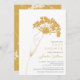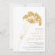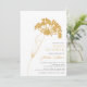 Bonito convite para chás de fraldas com um caule de flor creme colocado sobre fundo de mostarda. A parte de trás apresenta uma elegante parte de trás floral coordenadora para um toque especial extra.