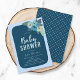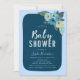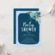 Chá de fraldas com flores e folhas contra fundo azul claro e azul, com efeito ligeiramente angustiante para um olhar rústico na frente, perfeito para um chá de fraldas de menino ou para um chá de inverno. O convite tem um padrão de bolinhas azul claro contra fundo azul com um efeito ligeiramente angustiante para um olhar rústico sobre o verso. Personalize este convite com seus detalhes substituindo o texto do marcador de posição. Para obter mais opções, como alterar a fonte, o tamanho/cor do texto, o espaçamento entre letras ou para contrair ou expandir o texto curvo, clique no botão "Personalizar". *Observe que a Marca d'água do Zazzle que aparece na visualização de zoom NÃO aparecerá no produto impresso final. © Rosewood e Citrus