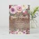 Belo convite para chás de fraldas com flores roxas e cor d'água rosa com uma fonte moderna, escrita à mão, sobre fundo rústico. Sacudir o convite do nosso chá de fraldas para ver uma floral correspondente de volta para um toque especial extra.