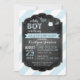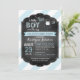 Fundo impressão de faixa azul e branca com jumper poka-dot com arco, fralda e botas no cartão de convite do chá de fraldas do garoto da linha de vestimenta.