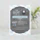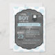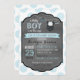 Fundo impressão de pontos azul e branco com jumper de ponto polka com arco, fralda e botas no cartão de convite para chá de fraldas de garoto da linha de clothesline.