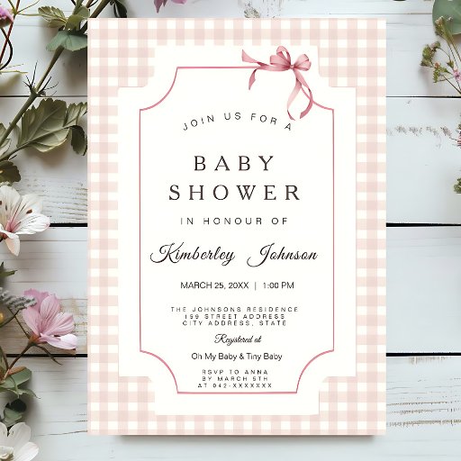 Celebrar a chegada de uma pequena garota com este charmoso convite para chás de fraldas, com uma fronteira típica de gingham rosa e para trás, elegantes, fontes de cinza e um doce arco de aquarela no topo. Perfeito para uma celebração em estilo country, este convite é quente e na moda. Personalize o texto para os detalhes do evento e crie um convite válido que os convidados adorarão.